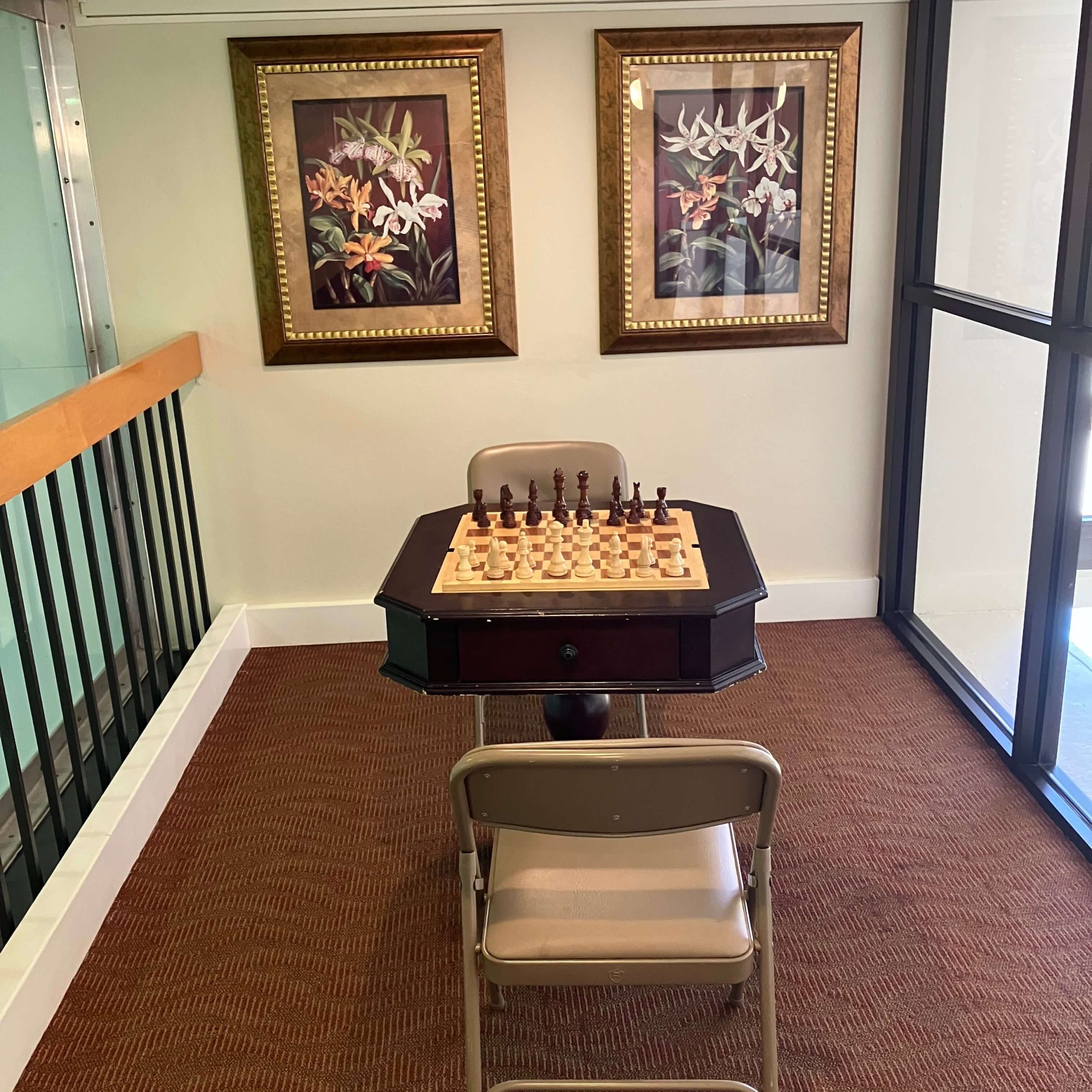 Overlooking the lobby and indoor court, the chess table offers a relaxed setting to enjoy a friendly match or challenge your strategic skills.